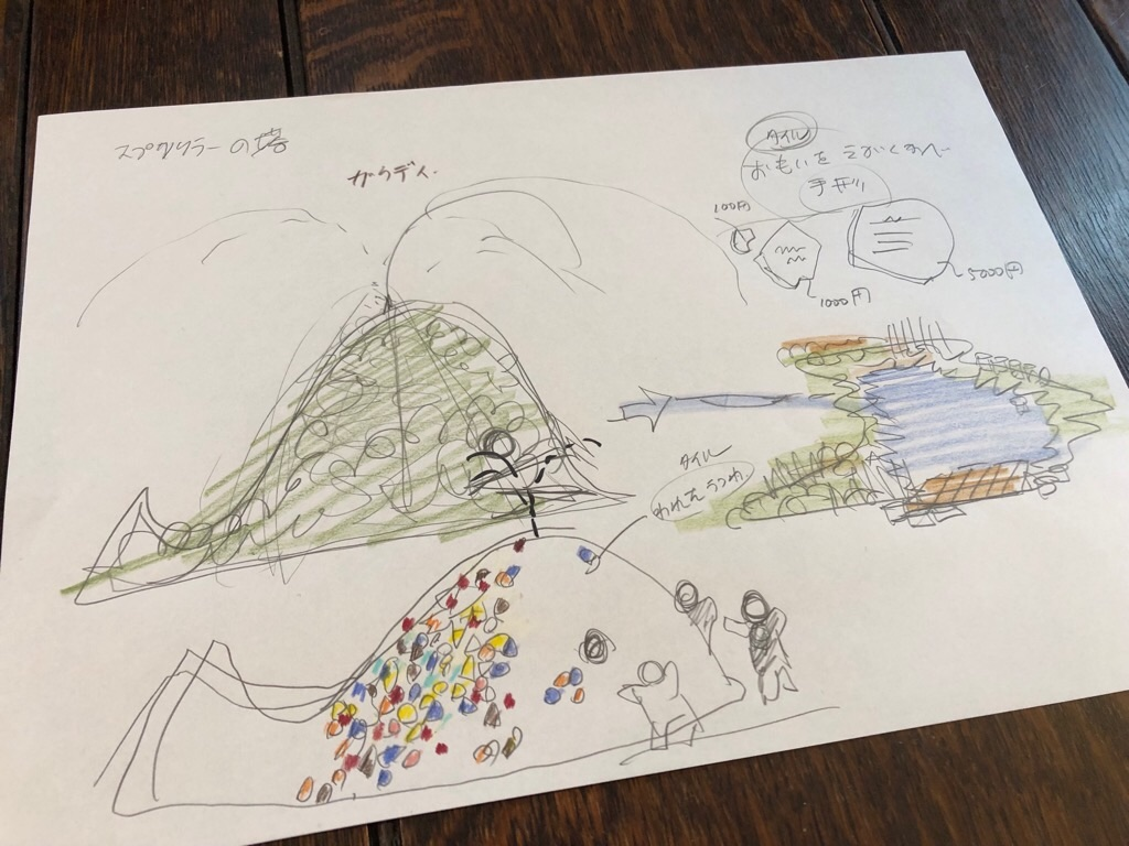 広い庭は水やりが大変だから、楽にできるツールが欲しい←スプリンクラーが必要←ただ単なる水やりではもったいない←スプリンクラーの塔にしよう←どうせならくじらのせなかから水出てたら子ども喜ぶよな