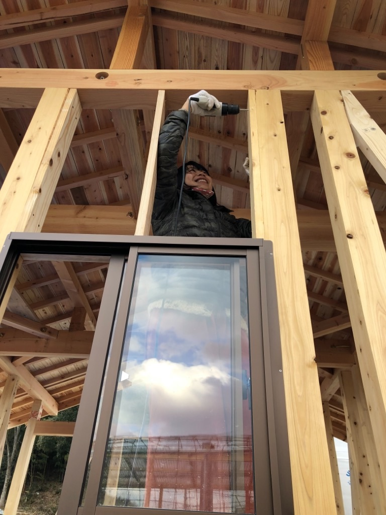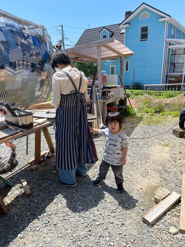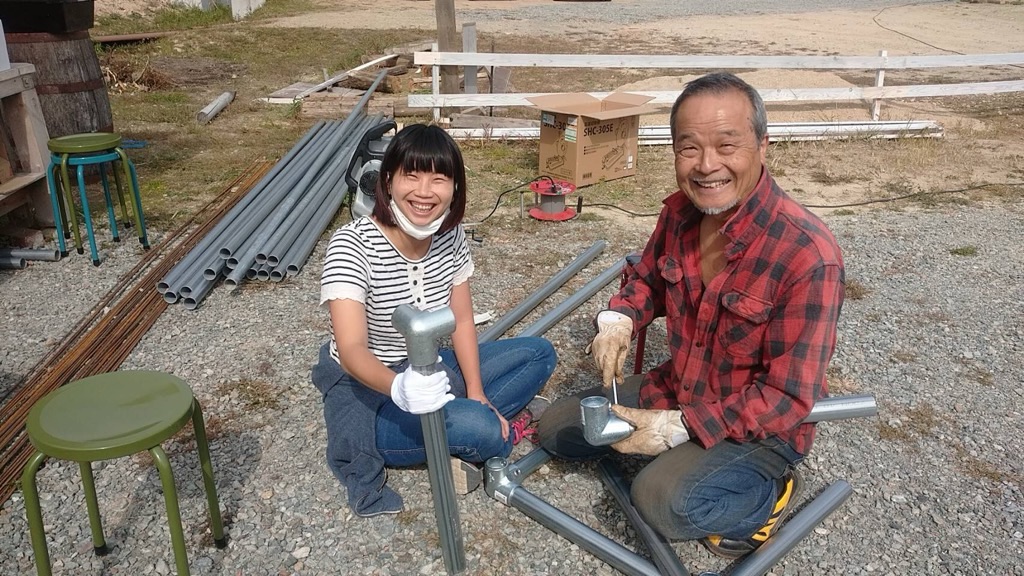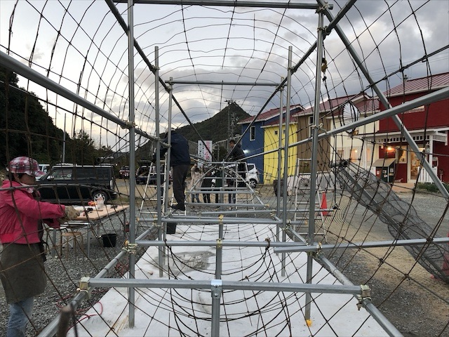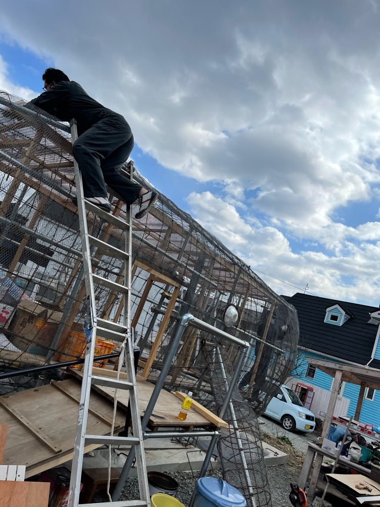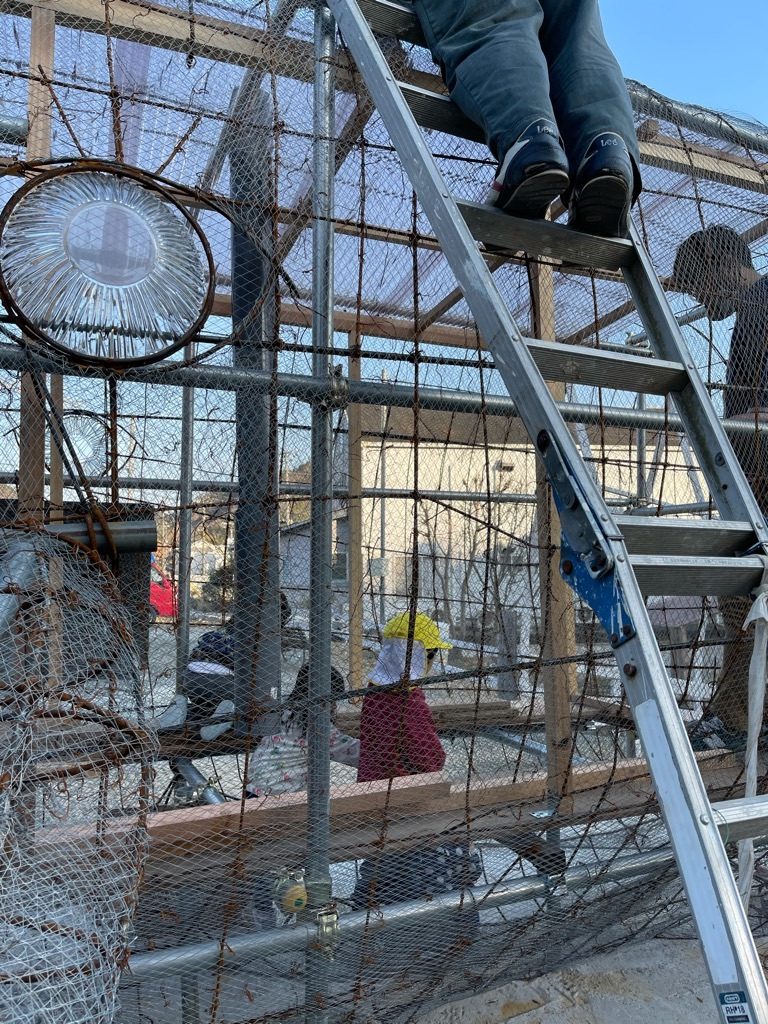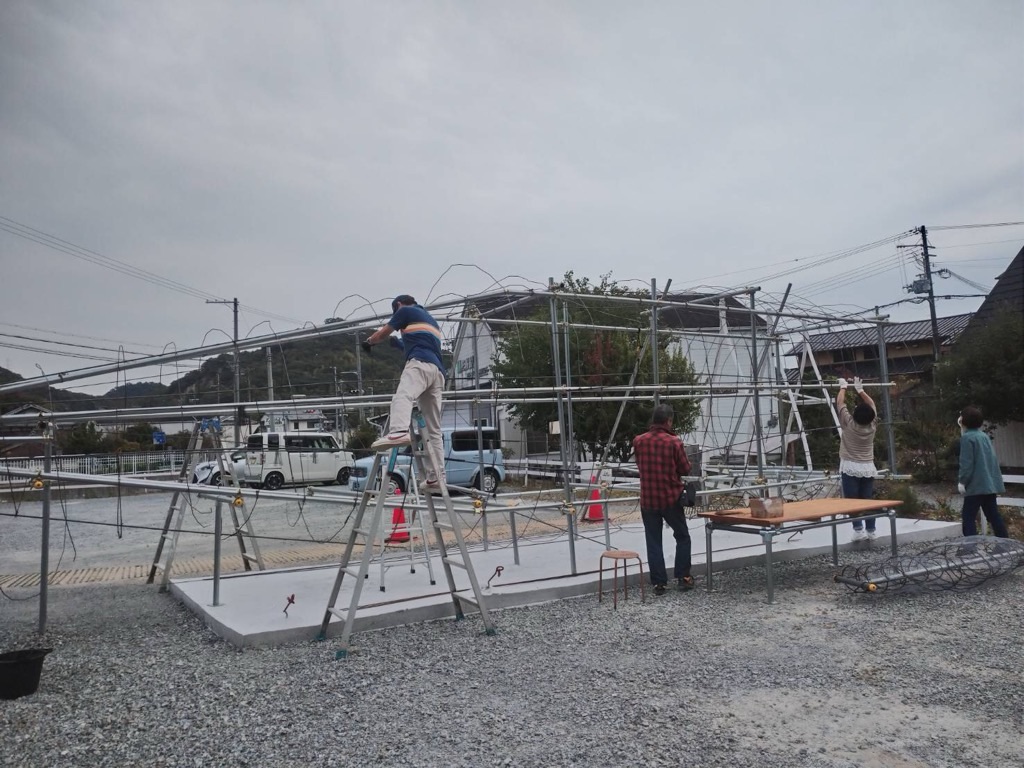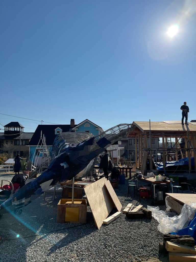 私は足場材なんか使ったことなかったけど、一甲さんの指導の下、臨月のおなかで単管パイプをブインブインとカットして、くじらの骨組みと基礎作り。