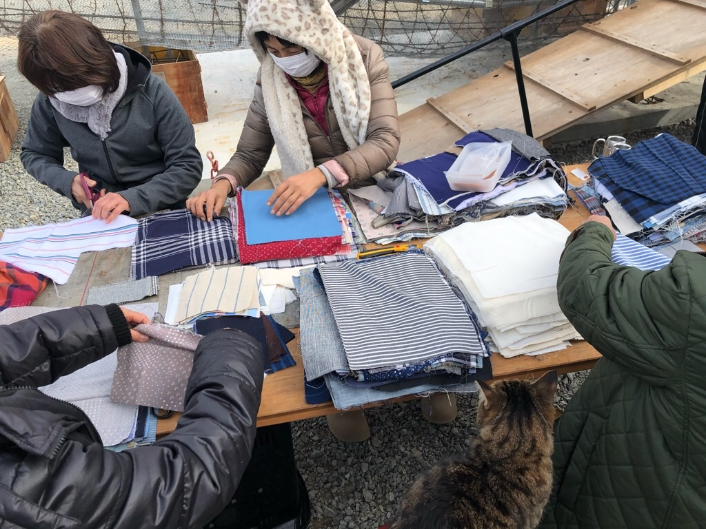 布の仕分けをしているところ。播州織の織元さんから寄付していただきました。