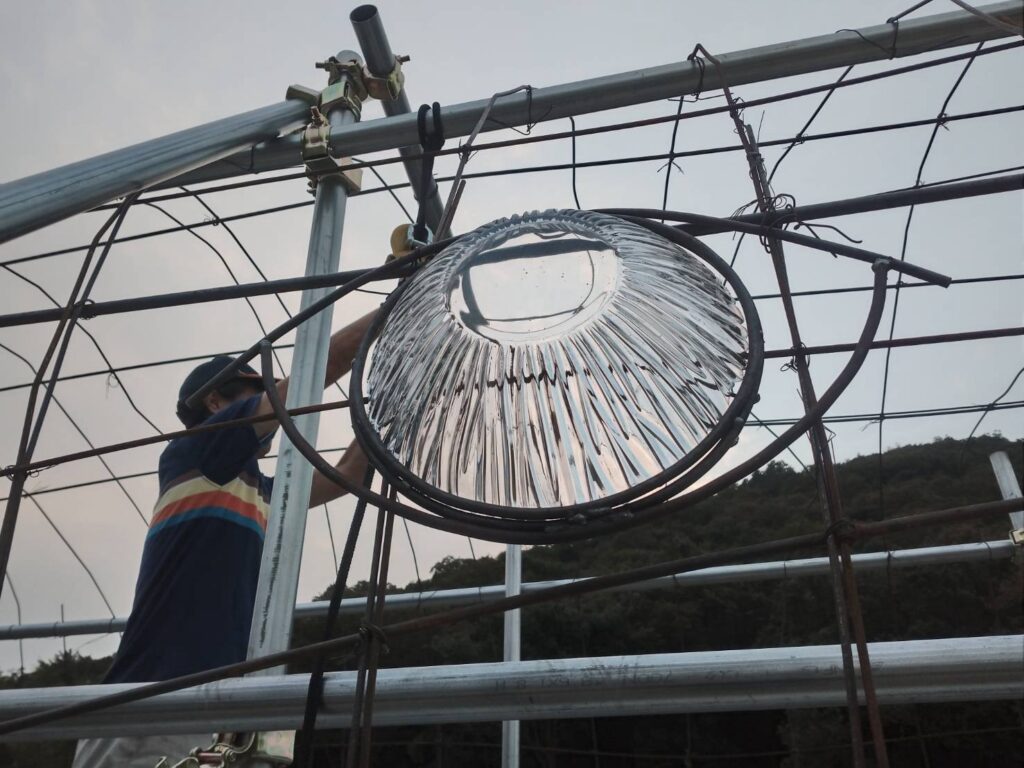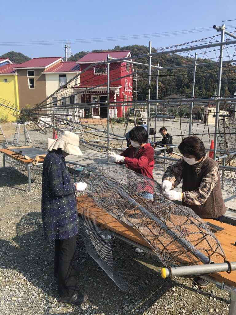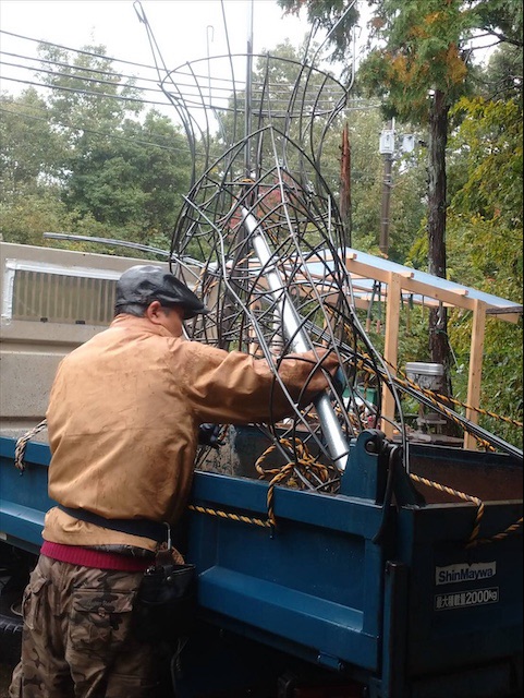 足場材を四角く組んでその周りに、太い針金を丸くカーブさせながら、ぐるぐる止め付けていきます。