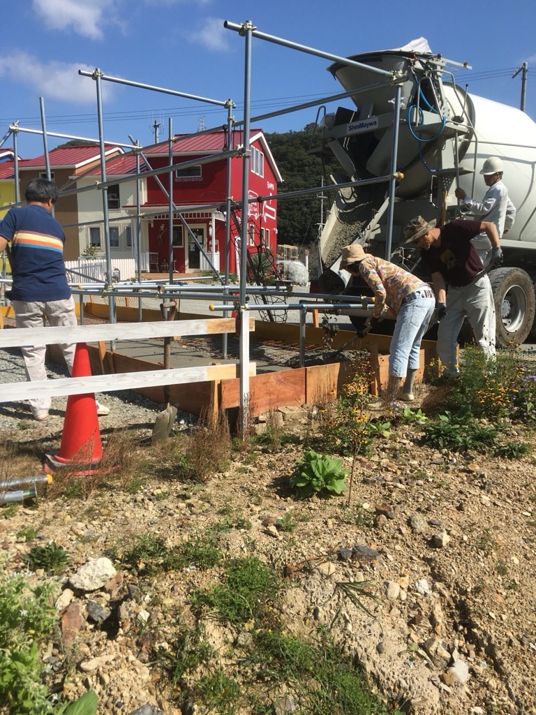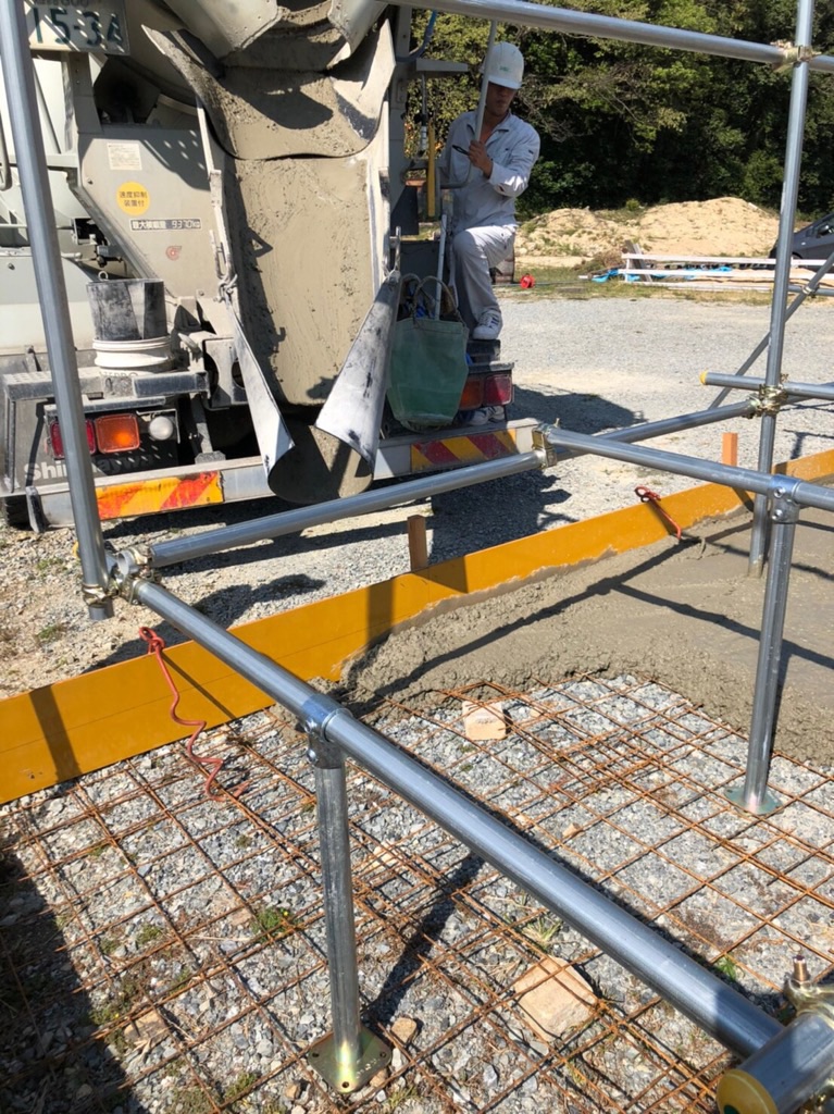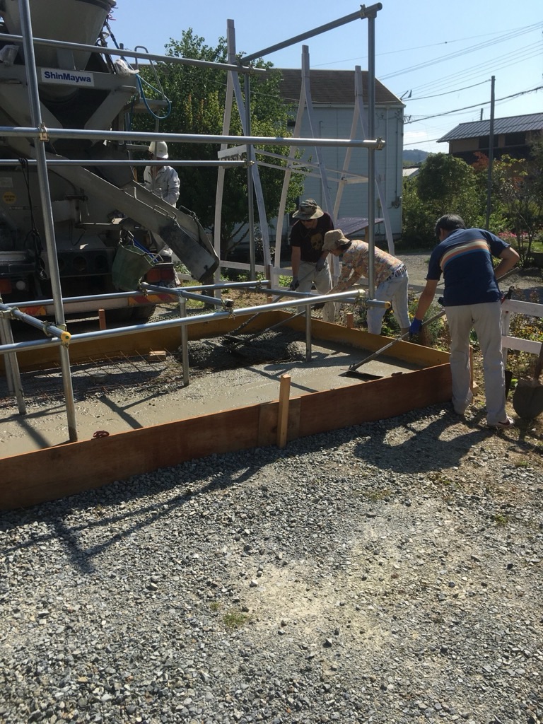 基礎にコンクリートを流したら、固まる前に、みんなで一気にならします!