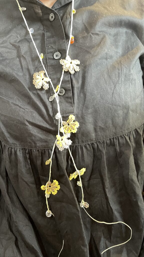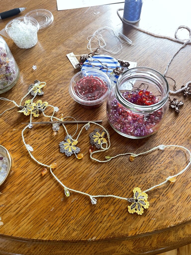 オヤの編み方を教えながら、私もそばで一本ラリエットを作りました。