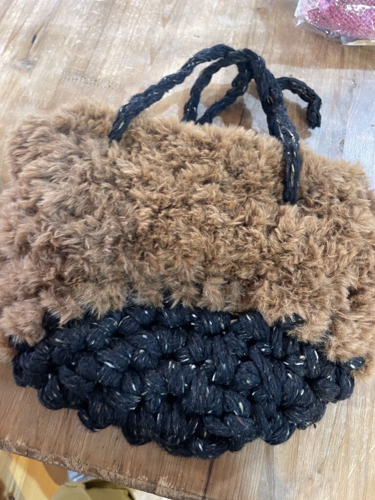 太いモコモコの糸で、あっという間にできる指編みのバッグ。みんなとおしゃべりしてる間に編めちゃった。取っ手をもう少し工夫してみよう。