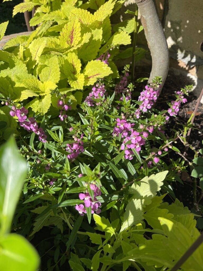アンゲロニアも冬まで次々と咲いてくれて重宝します。コリウスの明るい緑が鮮やか。