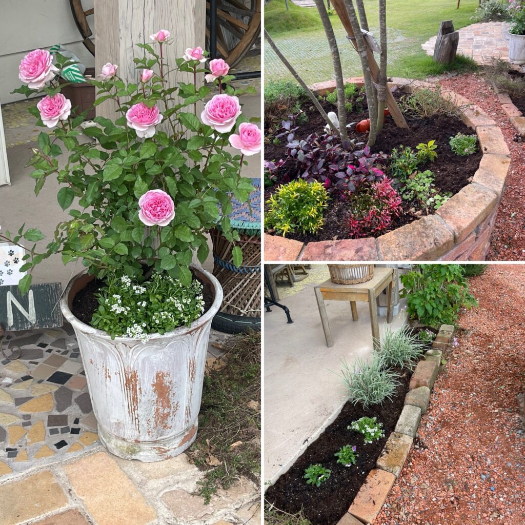 私も入荷したばかりのバラの苗を一鉢買いました。ザッパ村に帰ってから急いで花壇に植えました。奮発して買った薔薇の苗は素焼きの鉢にアリッサムと共に植えました。