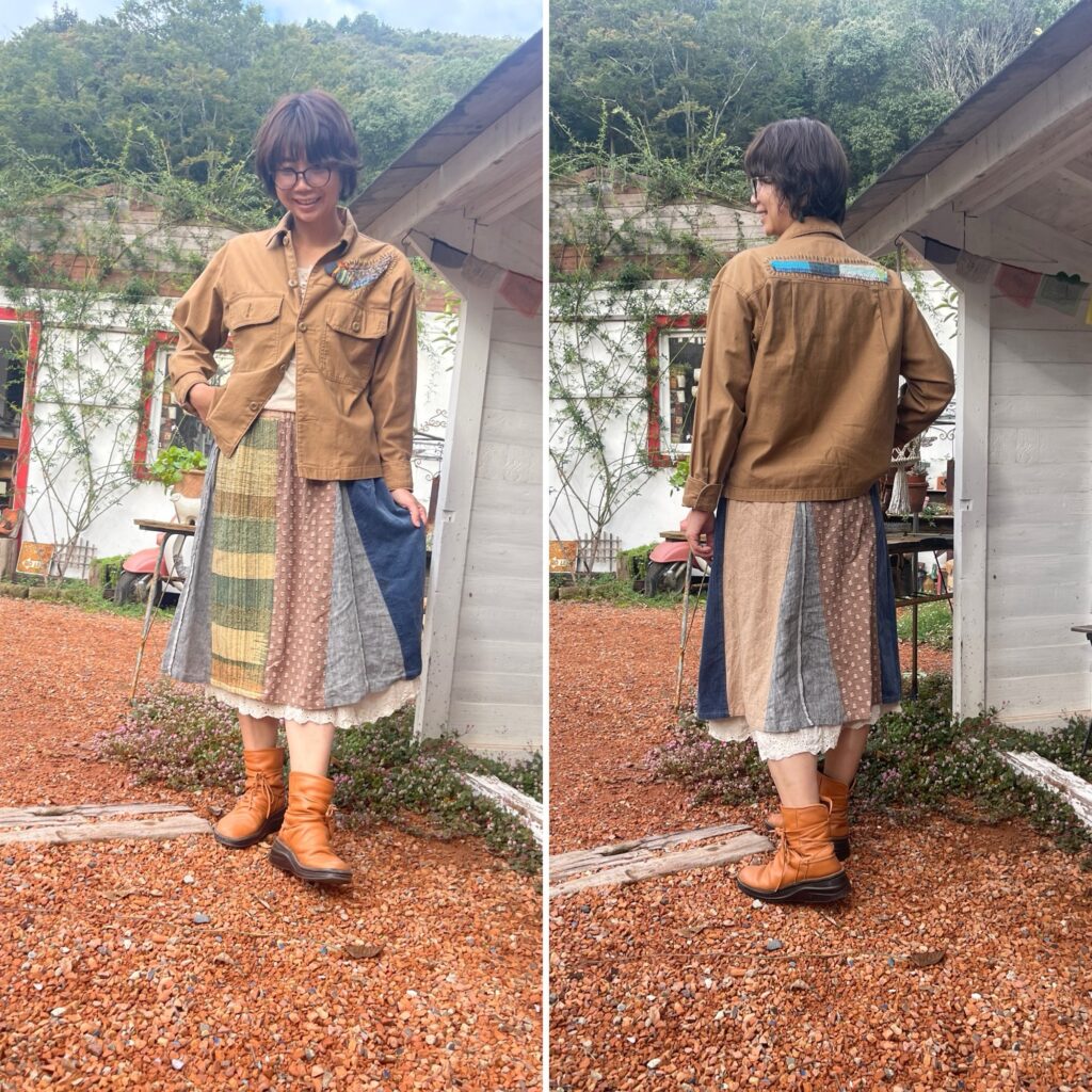 さおり織のパッチワークスカートに、リメイクジャケット。