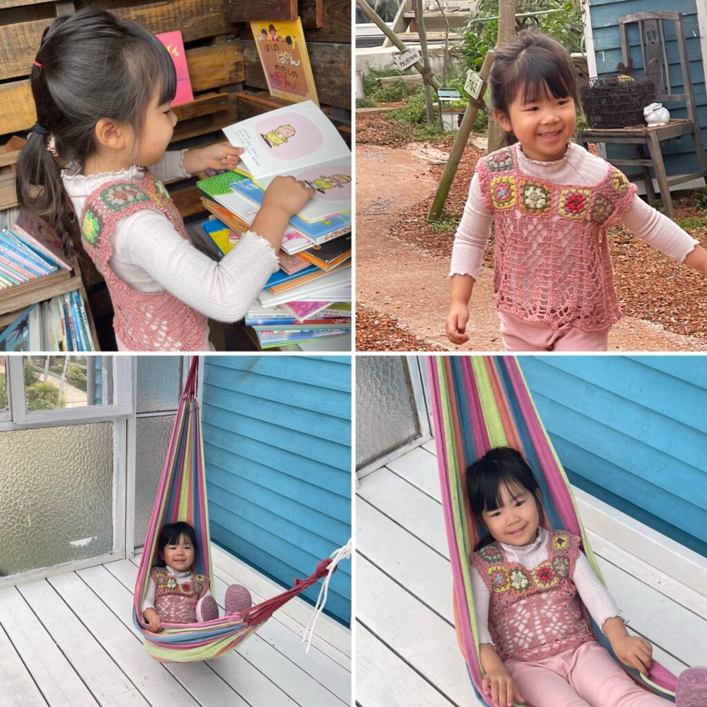 みのむし図書館で絵本を見たり、ハンモックしたり、お庭にいるといっぱい遊べて楽しいね。
