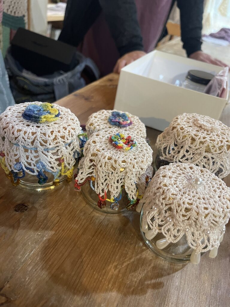 こんな素敵なレース編みの瓶カバーも出来上がってました。