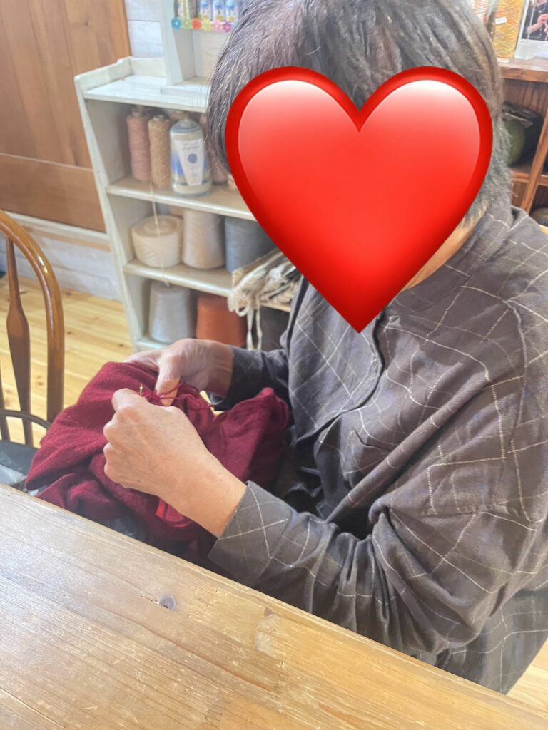 息子さんのカシミアセーターの繕いをされてます。母の愛ですねー!
