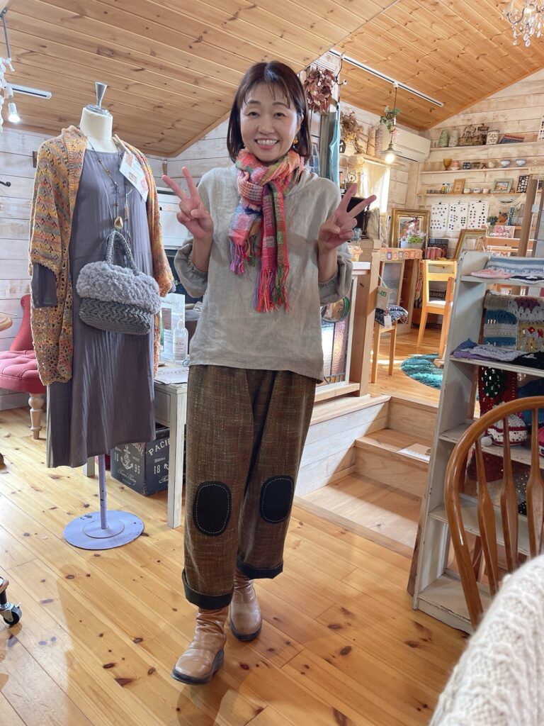 服の色を抑えて、自分で織ったというさおり織ストールで差し色に。似合ってるね〜