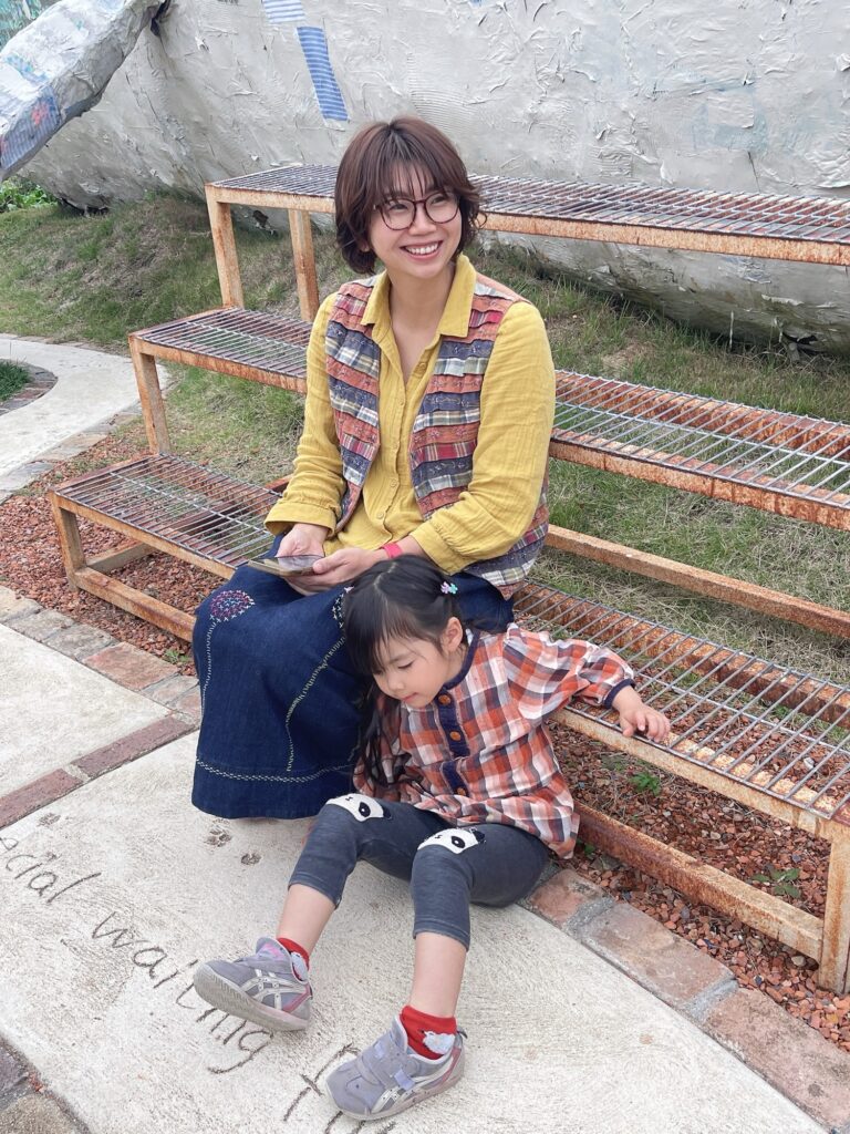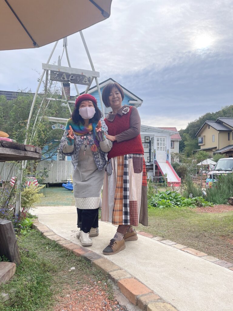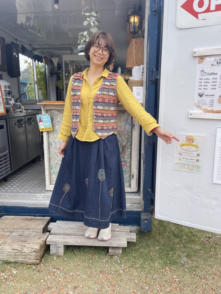 あゆはダブルガーゼのブラウスに、月曜市で買った刺繍スカート。ベストは古着です。