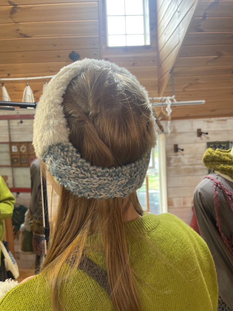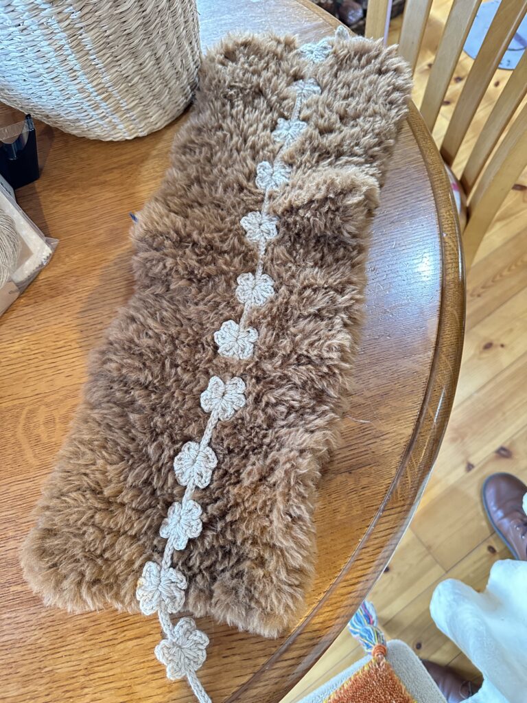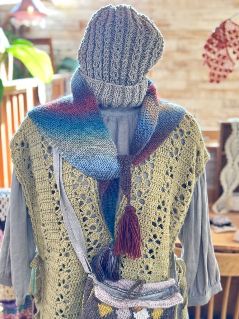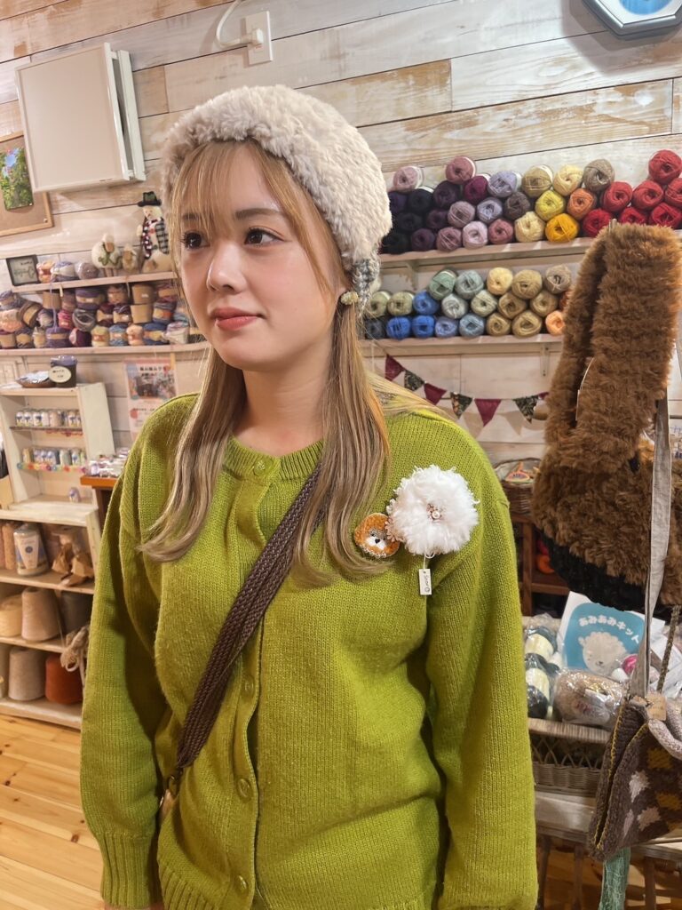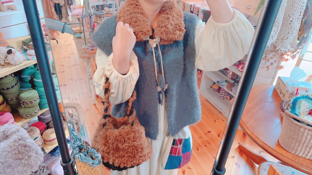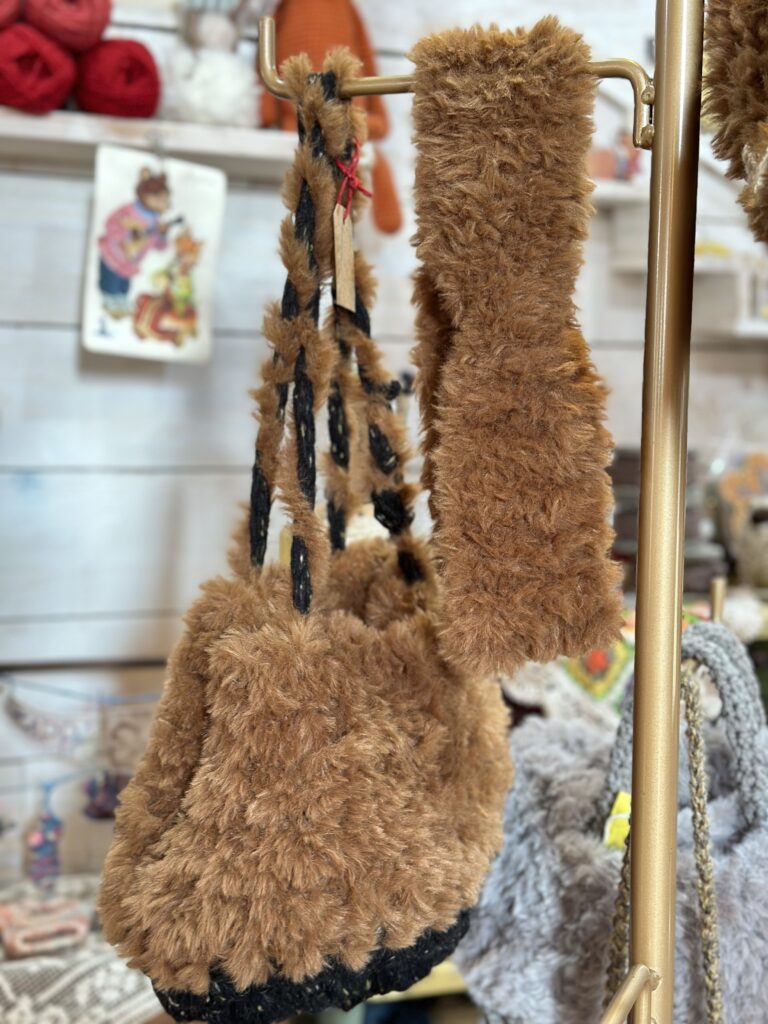 あと、モコモコのこの人気な毛糸!で編んだストール、バッグ、ヘアバンド!