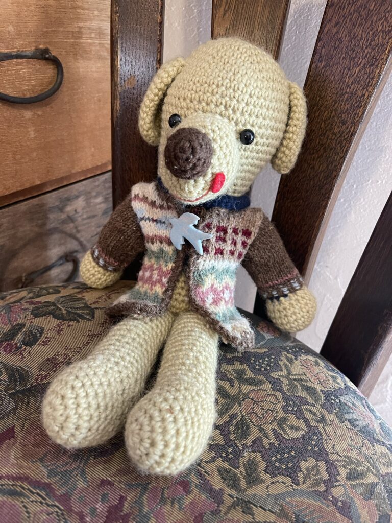 フェアアイルの試し編みをぬいぐるみの服にしました。この子にピッタリ!