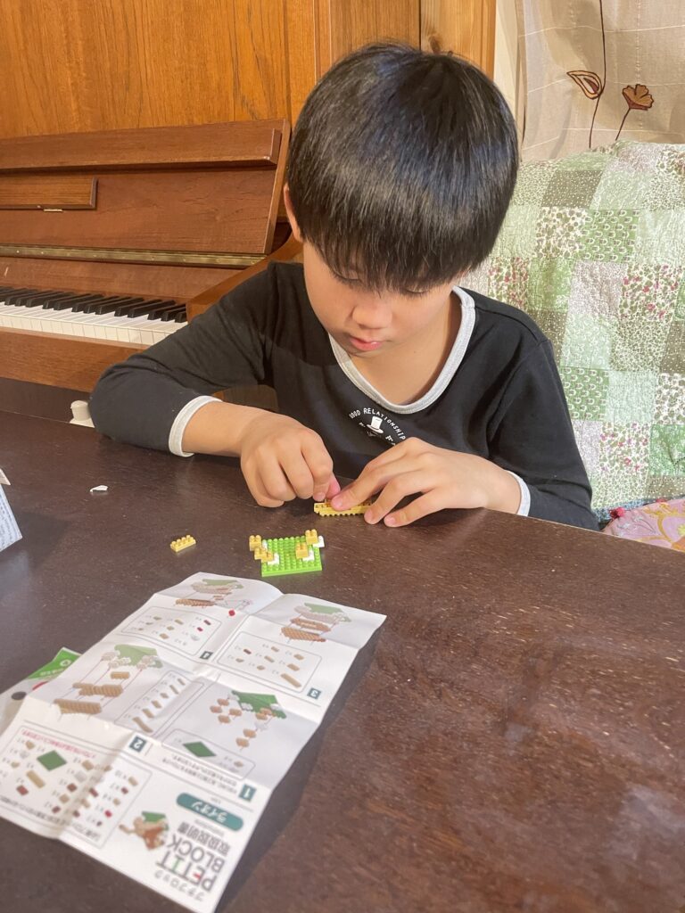 プレゼントで買ったおもちゃを組み立ててます。伸び伸び元気に育ってね。