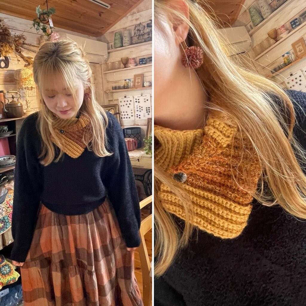 ブラーノスタッフのまおちゃんは、編み編み販売会でゲットしたスヌードをしてくれてました。手作りのポンポンピアスや、スカートと