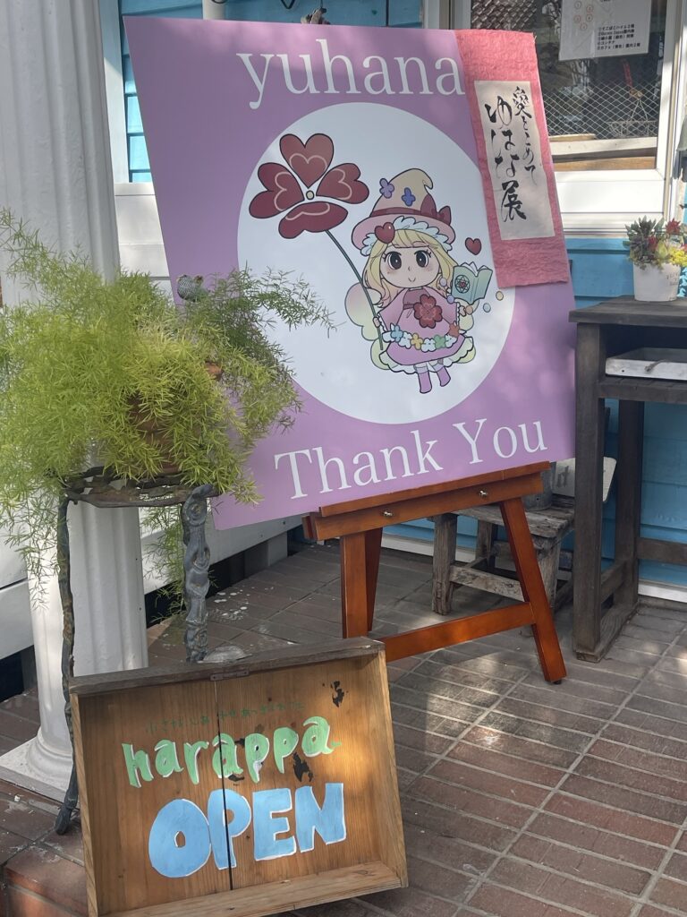 カフェはらっぱではゆはな展が開催されています。カフェを楽しみながら心あったまる絵や文字を楽しんでいって下さいね。