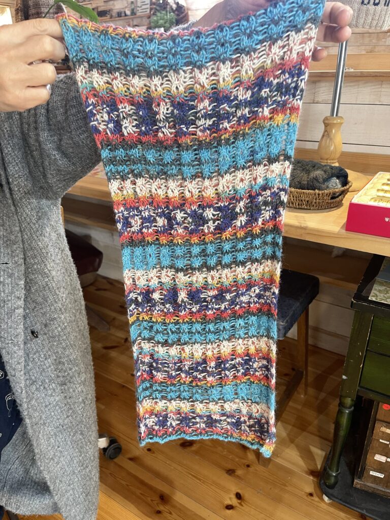ノット編みと、裏編みの部分をわざと目を落とす編み方のストール。オパールの糸一個で編みきり。よく伸びて柔らかいです。
