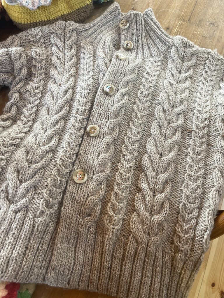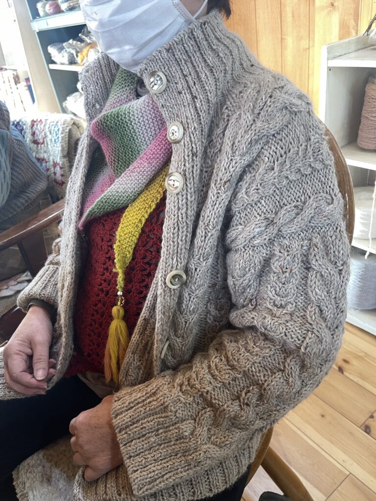 縄編みのカーディガンも素敵💓