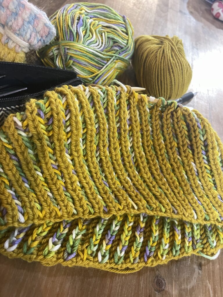 イギリスゴム編みのスヌードを編んでいます。