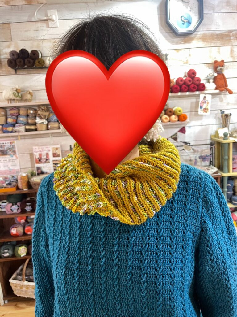 私が編んだイギリス編みのスヌードを付けてもらいました。