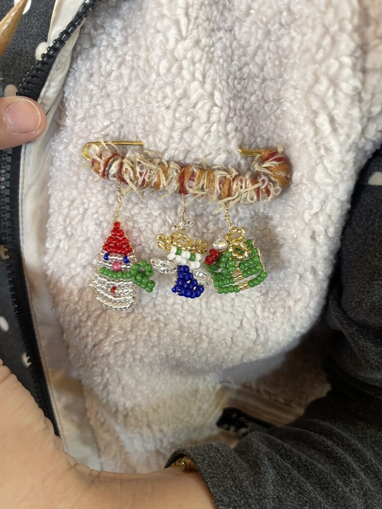 先日のぴよこ先生のビーズ教室で作られたブランケットピンのブローチかわいい💕